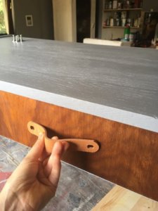Az asztal fogantyúját a nagy furat táv miatt választottuk az IKEA-ból, ennek a bőr cuccnak teljesen mindegy hogy hová teszed a csavarokat(ez amolyan IKEA életérzés). Viszont sajnos a színével nem tudtam megbékélni, ezzel a szürkével nagyon csúnya volt és természetellenes. Szerencsére jött az ötlet, hogy megfordítom és a kezeletlen oldalával kifelé használom fel, így egy természetesebb hatást kelt, megszerettem.![]()