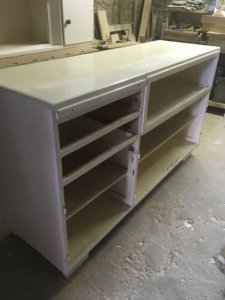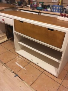 Sajnos a lábakat is vágtuk, mert különben nagyon magas maradt volna, de így már tényleg készen állt egy reggeliző asztal, ami egyben tároló is.