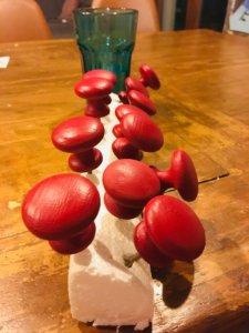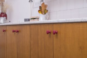 A felső rész a túloldalra került, a régi helyére, de így legalább végig vonult ez a stílus, kellett ez a pimasz mély bordó szín a gombokon, a hokedlik ülőrészén és a kiegészítőkön.