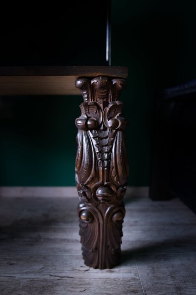 A tv alá kerülő konzol asztal lábai egy kidobásra ítélt szekrény díszítő elemeiből lettek, igazán szép és értékes faragás menekült így meg: